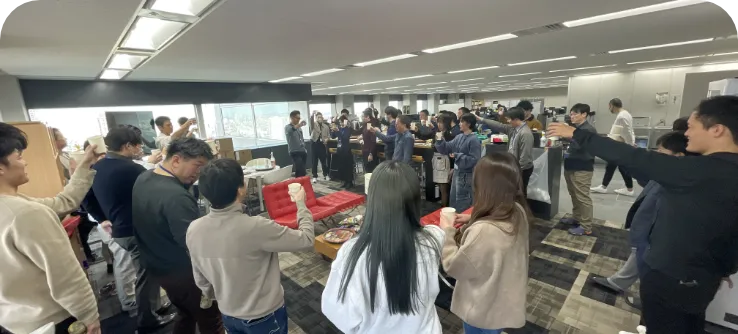 1年間の労を労うための会。自由参加ですが、普段接点の少ない社員同士で交流できる機会なので、年末の忙しい時期にかかわらず多くの社員が参加しています。